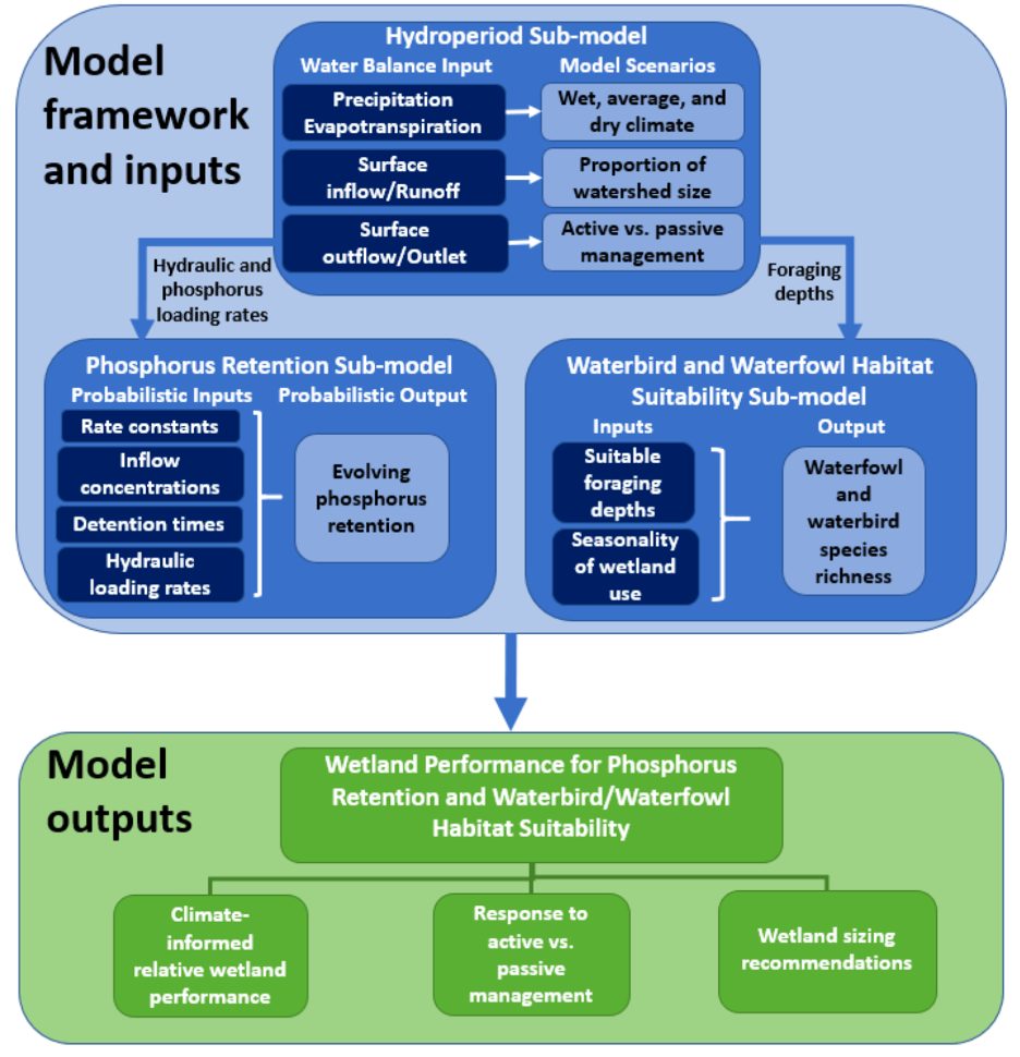 We developed an intermediate complexity model that links P retention and waterfowl/waterbird habitat suitability under various climate, management, and design scenarios by combining 3 sub-models (Figure 2). A hydrologic model based on a wetland water balance informed by climate, management, and design scenarios generated monthly hydroperiods, which were used to inform P retention and waterfowl/waterbird habitat sub-models. We applied the modeling framework to the MRW as a case study with the use of a spreadsheet tool. The process for model development and its implementation as a practical spreadsheet tool in the MRW case study is described in the subsections that follow.