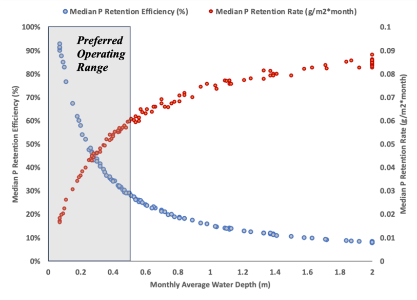 Modeled scenarios indicated that P retention efficiencies and rates have opposite relationships to water depth (Figure 3). P retention efficiency decreases asymptotically with water depth whereas P retention rates increase asymptotically with water depth.