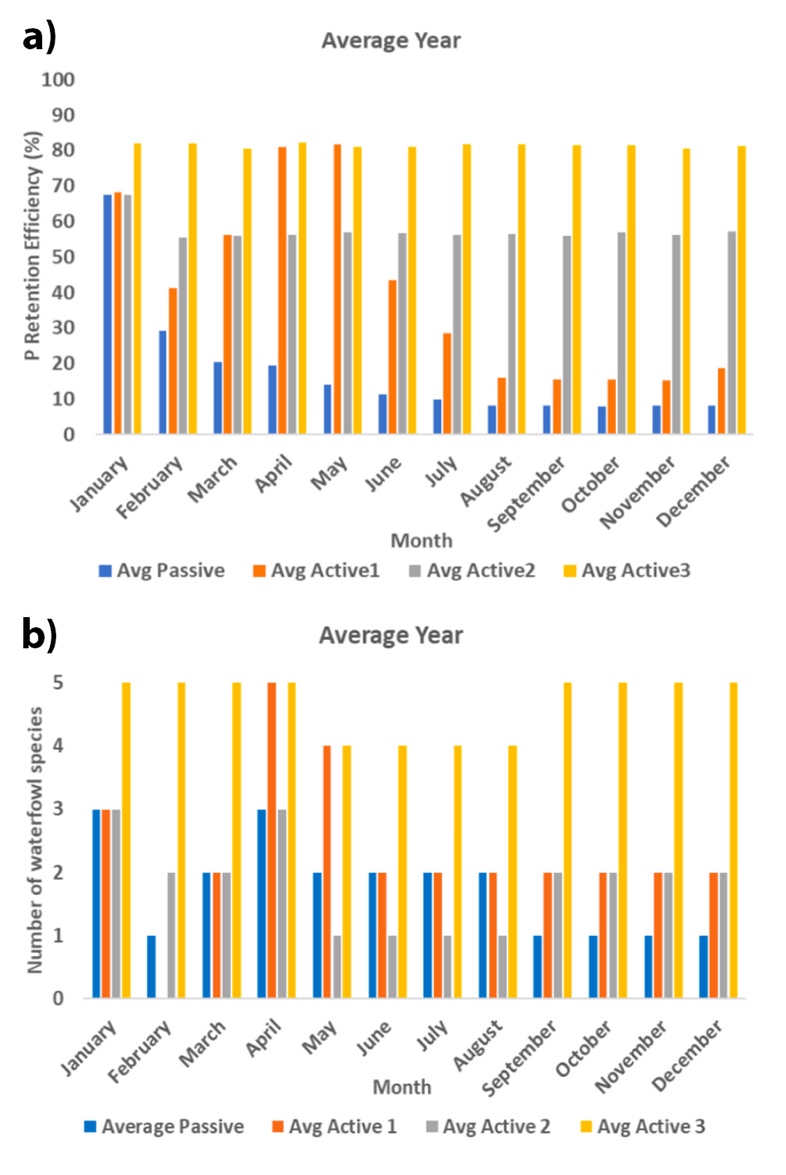 From month to month in all climate scenarios, active management of 0.10 m of water depth (Active 3), which corresponded to a median HLR of 0.34 m/month and a PLR of 0.068 g/m2*month in the IQR, achieved the best results for both P retention efficiency (Figure 4a) and waterfowl habitat provisioning (Figure 4b). However, when looking over the entire year at management and climate scenarios, dynamic active management (Active 1) performed the best for waterfowl and waterbird habitat provision while still providing appreciable relative P retention rate benefits (Figure 5a). Additionally, dynamic active scenarios (Active 1) supported the greatest number of plant species, which were assessed separately.