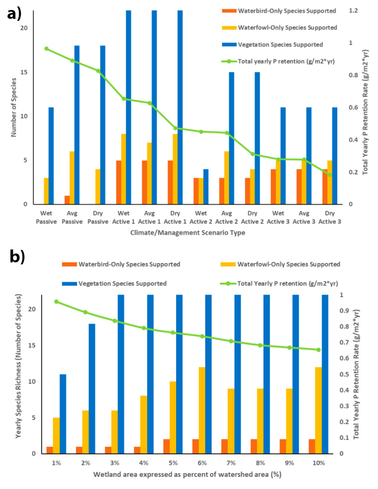 Overall, model results indicated that lower (<0.5 m) water depths, corresponding to lower HLRs, larger wetland sizing, drier climate years, and active management, generally had the highest potential to simultaneously achieve both P retention and waterfowl/waterbird habitat objectives. Direct tradeoffs occurred when considering P retention rates vs. P retention efficiency, which subsequently revealed direct tradeoffs between P retention rates and waterfowl/waterbird habitat suitability. Tradeoffs with waterfowl/waterbird habitat suitability and P retention changed depending on timescale and species prioritization.