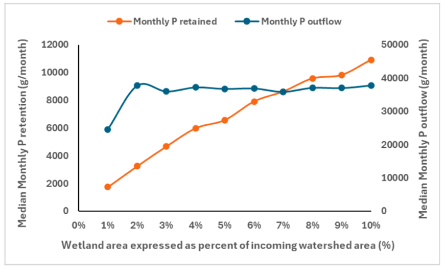 In the MRW, wetlands are typically passively managed and sized at <12 ha and <2% of the contributing watershed area (Ducks Unlimited, personal communication [unreferenced] 2023). The results from this case study indicate that these common design and management practices are not robustly serving waterfowl/waterbird habitat and P retention objectives.