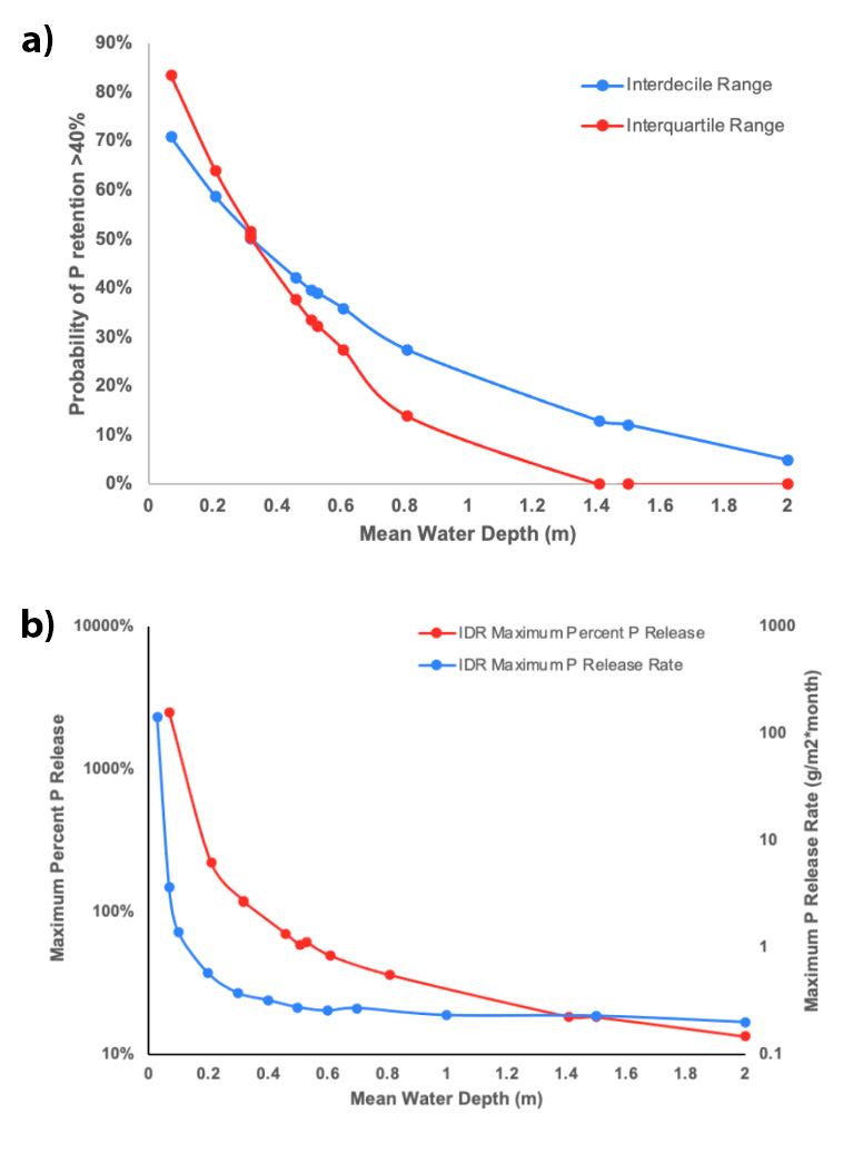 Fig. 7 Data filtered in the IDR and IQR demonstrating (a) probability that wetlands retain >40% of inflowing P over varying water depths and (b) the maximum amount of P released as a percentage and as a rate over varying water depths.